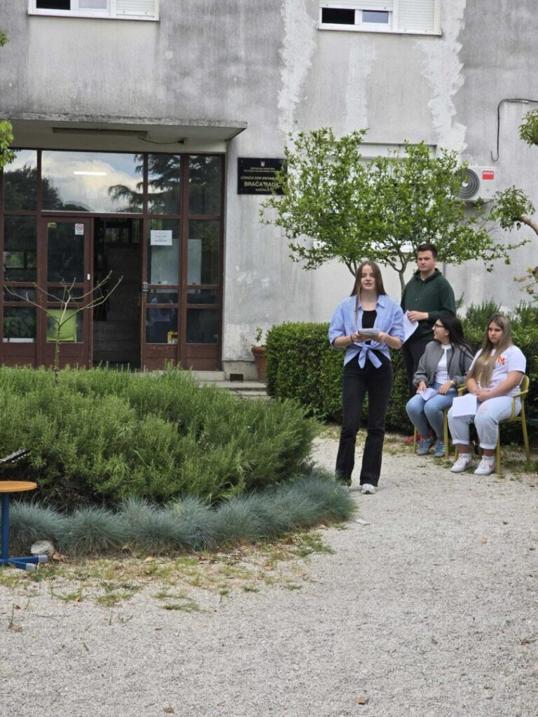 Danas smo, u proljetnom ambijentu našeg školskog dvorišta, obilježili 15. Noć knjige kao i Dan hrvatske knjige kako bismo još jednom podsjetili na važnost čitanja.