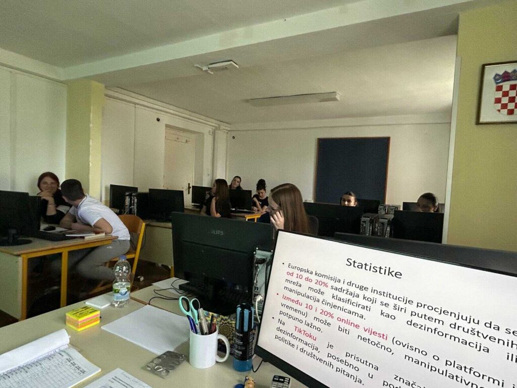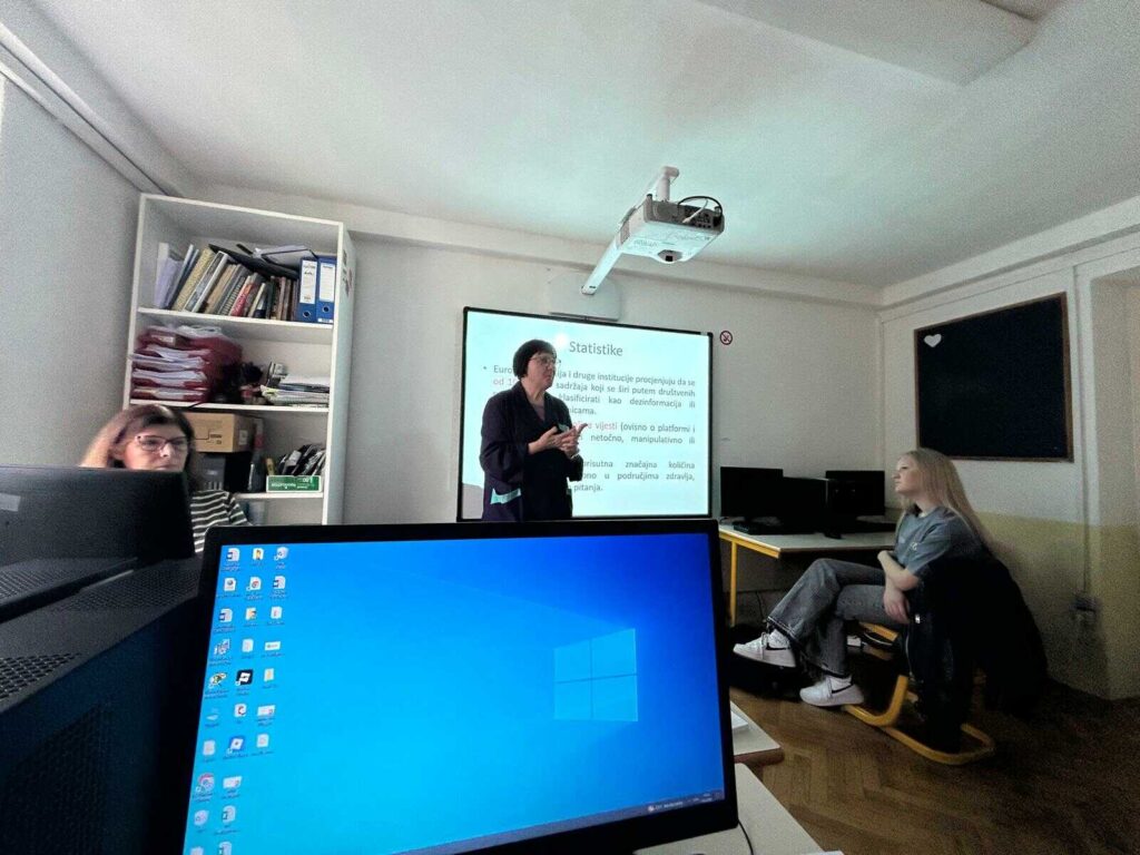 Školska knjižničarka Mirna Luketin u suradnji s prof. Andrijanom Skelić pripremila je izlaganje s radionicom pod nazivom Lažne vijesti u medijima: razmislimo, razotkrijmo, dokažimo u kojem su sudjelovali učenici 1. a odjeljenja.