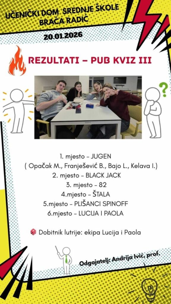Učenici učeničkog doma ponovno su se okupili na trećem pub kvizu u sklopu projekta „Znanje kroz igru“, koji potiče timski rad, druženje i učenje kroz zabavne kvizove. Projekt se sastoji od četiri kviza tijekom školske godine, a završava finalnom večeri s posebnim nagradama za najuspješnije sudionike.