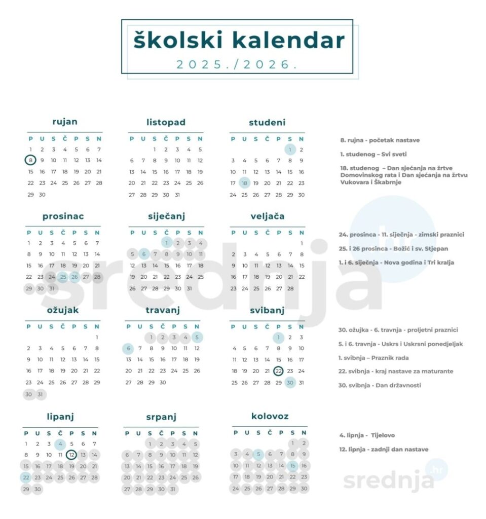 Nastavna godina počinje 8. rujna 2025., a završava 12. lipnja, odnosno 22. svibnja 2026. godine za maturante. Ustrojava se u dva polugodišta – prvo će trajati od 8. rujna do 23. prosinca 2025. godine. Drugo polugodište započinje 12. siječnja i traje do 12. lipnja 2026. godine, odnosno za maturante do 22. svibnja.