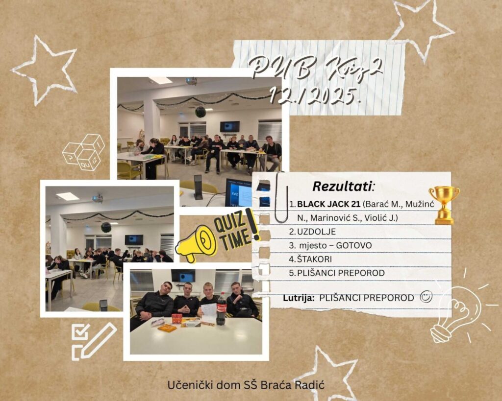 U sklopu projekta „Znanje kroz igru“, koji potiče učenike na učenje, druženje i razvijanje suradničkih vještina kroz zabavnu i edukativnu formu pub kviza, održan je drugi kviz u ovoj školskoj godini. Cilj projekta je kroz četiri kviza tijekom godine, te završnu večer s prigodnim nagradama, stvoriti poticajno i motivirajuće okruženje za učenike.