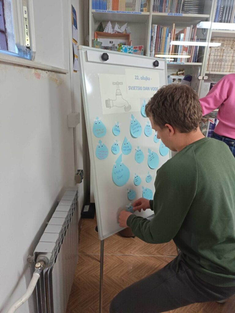 Za kraju sata učenici su na papirnatim kapljicama vode napisali zašto im je voda važna, što voda znači, zašto vole vodu, zašto je trebamo čuvati. Svoje kapljice su nalijepili na ploču pa smo zajedno pročitali i prokomentirali ove lijepe zapise.